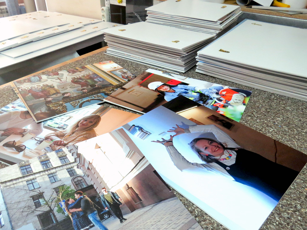 Фотографія друкується на фотовінілі, потім ламінується (ламінаційна плівка захистить вашу роботу від механічних пошкоджень) і ламінатором монтується до пластику 4 мм завтовшки (Товщина пластику може бути від 2 до 10 мм). На зворотному боці фотографії приклеюється кріплення.