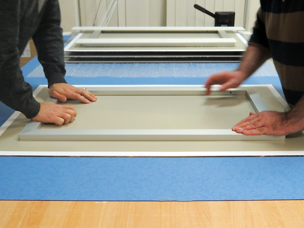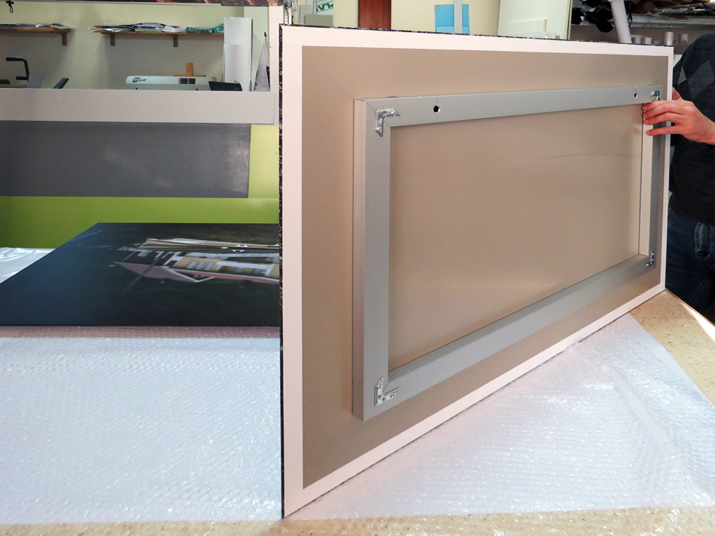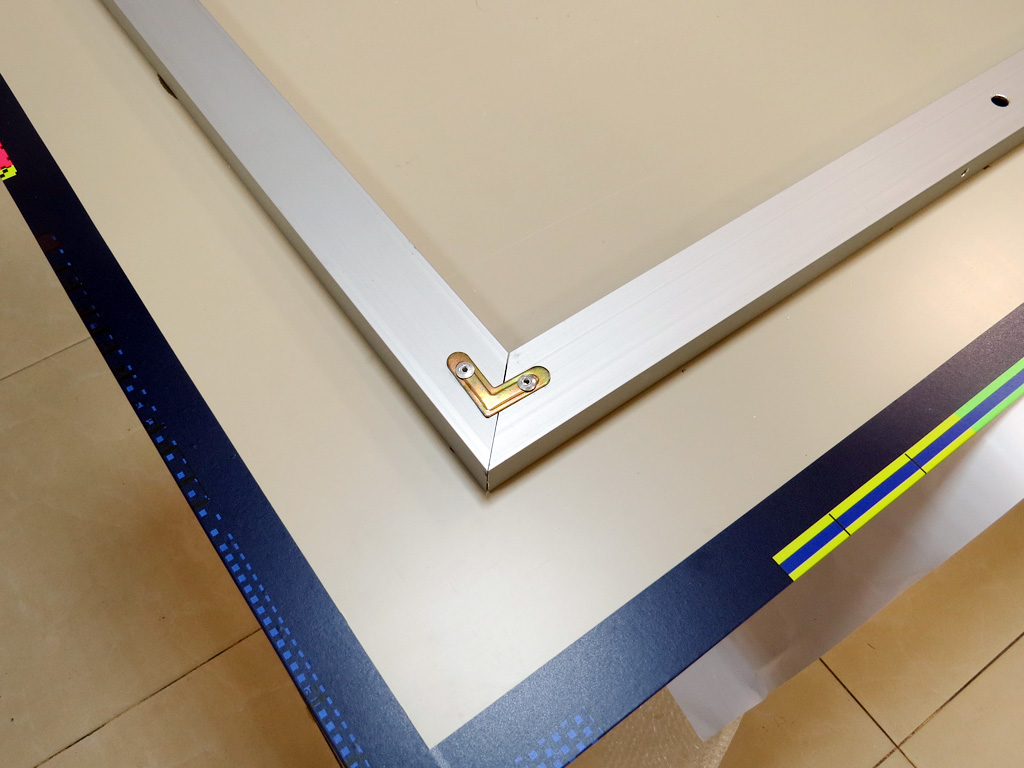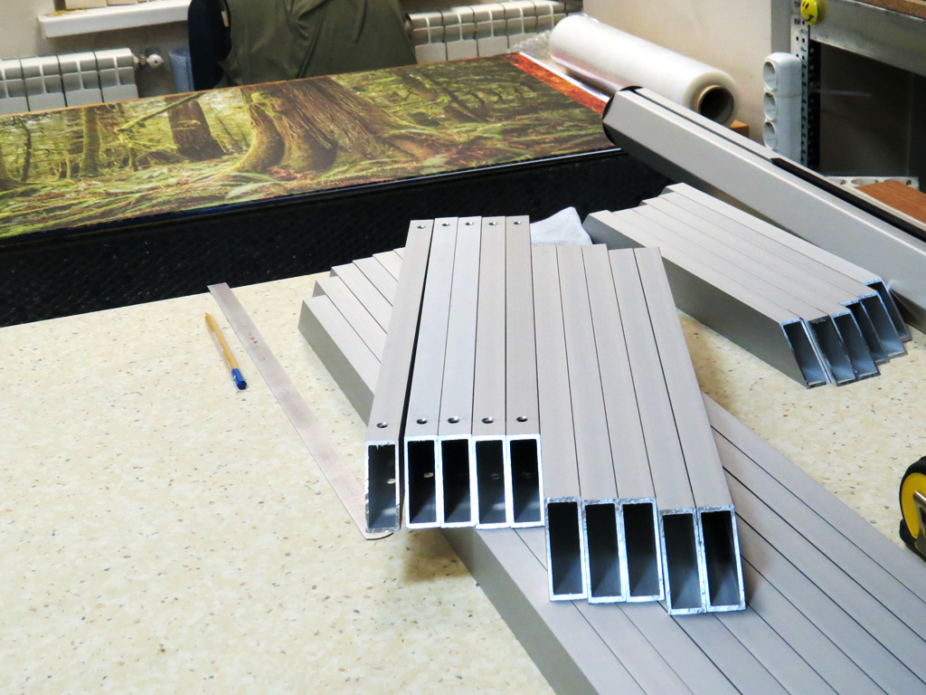 На тыльной стороне монтируется каркас из алюминиевого профиля, он придает жесткости, служит крепежом и добавляет объема работе.